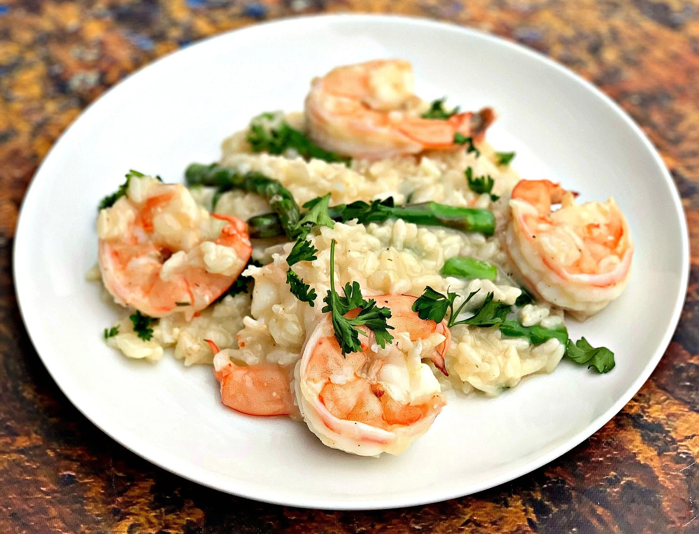 Tender shrimp poached in a flavorful broth with aromatic vegetables and white wine until plump and tender. Served with creamy tomato-chive risotto with steamed snow peas, a rich sherry shrimp sauce, and a side tossed salad with red wine vinaigrette