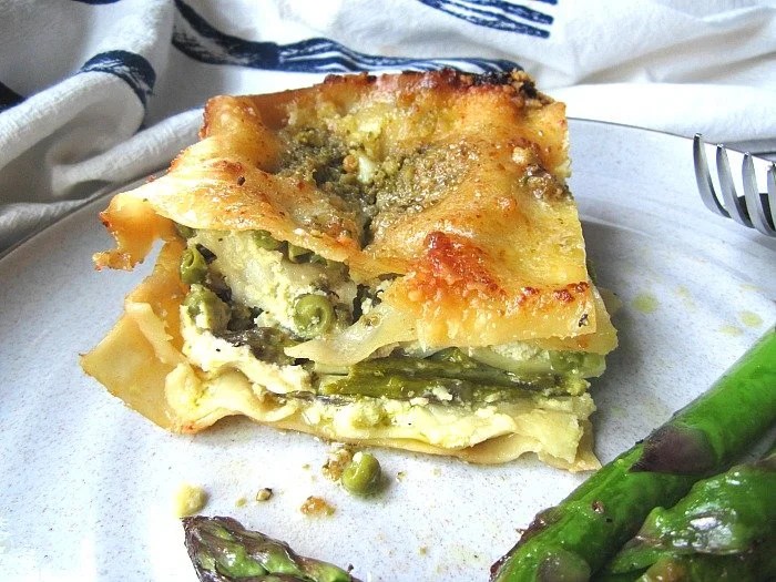Fresh asparagus, spring peas, roasted red pepper, spinach, and roasted eggplant layered between sheets of fresh pasta with parmesan and goat cheeses, then baked until bubbly and brown. Accompanied by a light creamy tomato sauce, house baked garlic bread, and a side Caesar salad