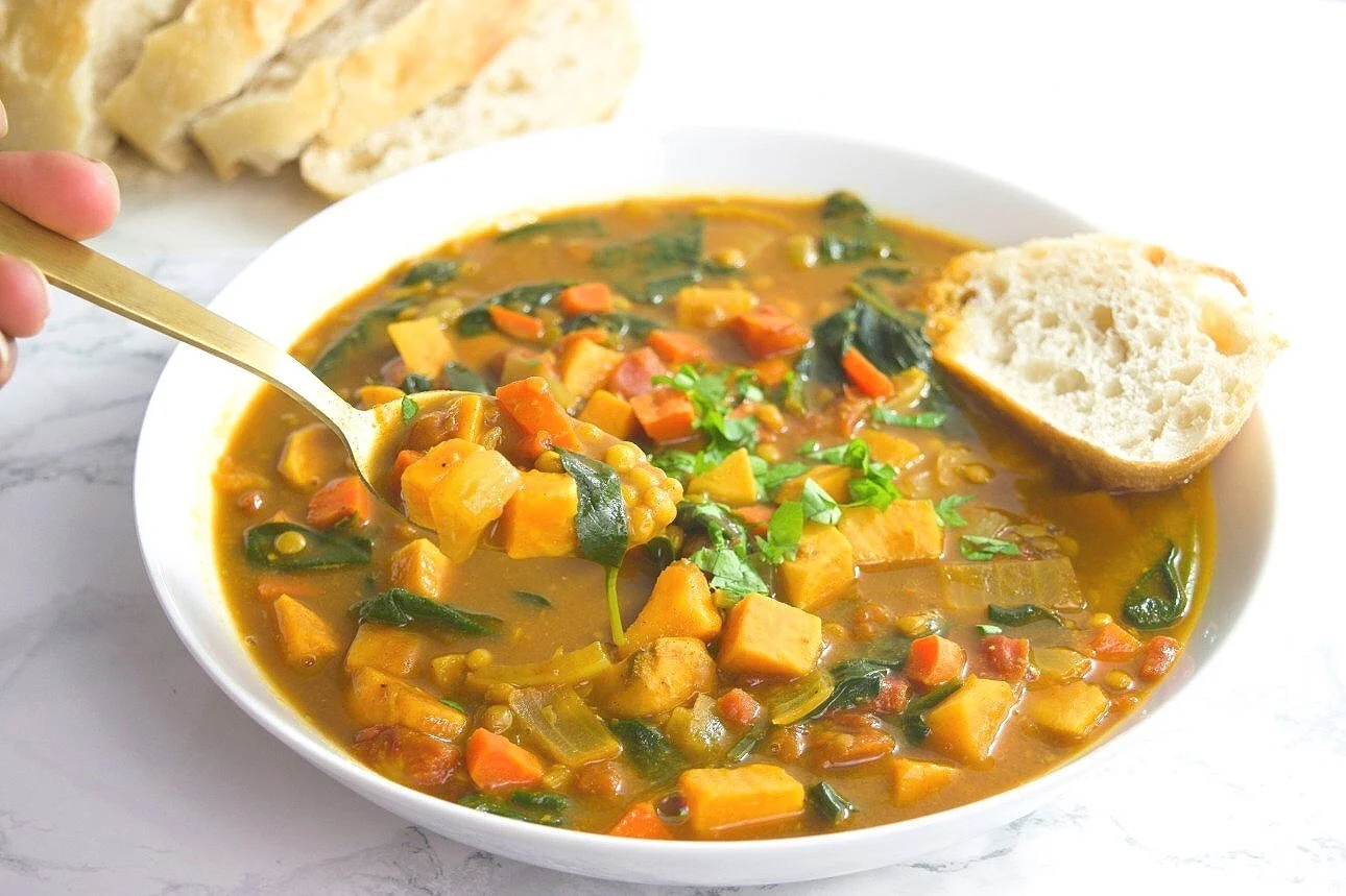 Roasted sweet potatoes simmered with sauteed carrot, celery, onion, garlic, ginger, and spices reminiscent of pumpkin spice until veggies are tender and flavors married then finished with a generous splash of coconut milk.